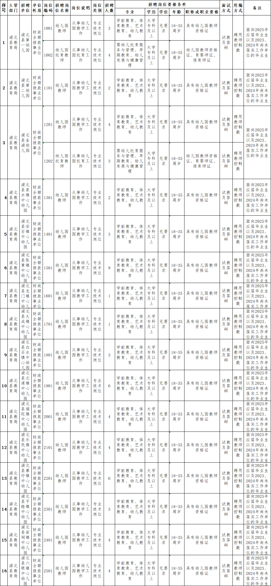 附件1:2025年度浦北縣赴高校招聘教師崗位信息表