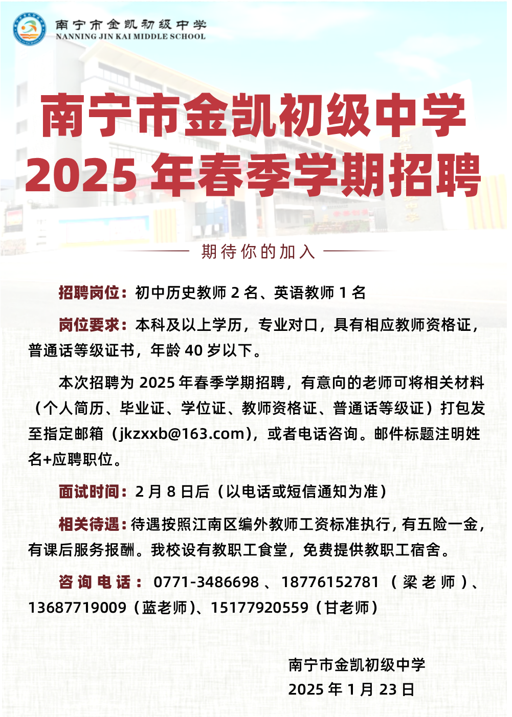2025年南寧市金凱初級中學誠聘歷史、英語教師