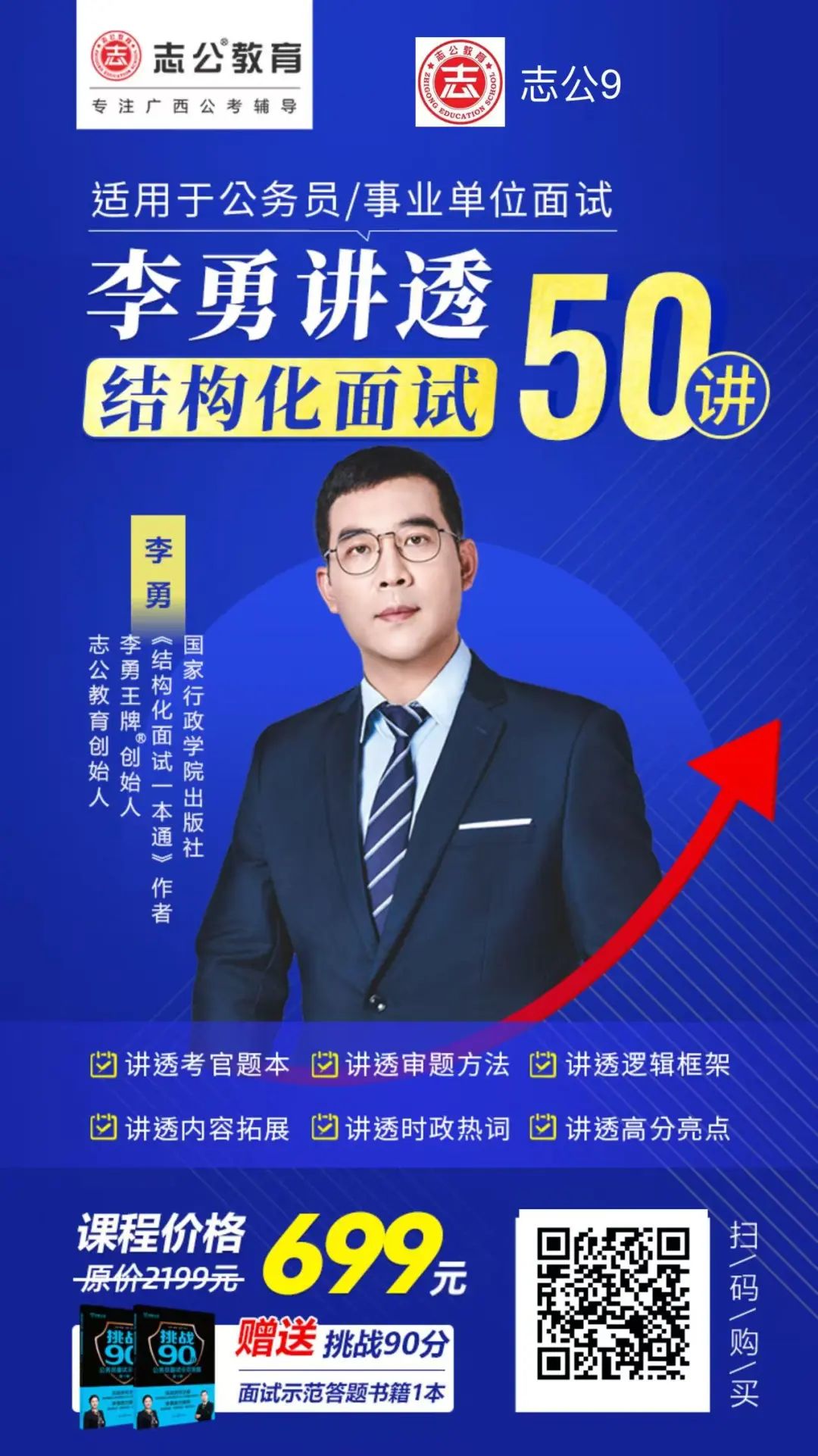 李勇——志公教育創(chuàng)始人、李勇王牌®班創(chuàng)始人,志公教育名師。主講結(jié)構(gòu)化面試、結(jié)構(gòu)化小組面試,專注廣西公考輔導(dǎo)17年。獨(dú)創(chuàng)“萬(wàn)變積木教學(xué)法”,擅長(zhǎng)在教學(xué)中運(yùn)用金字塔原理和行動(dòng)學(xué)習(xí),課堂生動(dòng)有趣,形成獨(dú)特的授課體系。激發(fā)學(xué)員學(xué)習(xí)興趣的同時(shí)開(kāi)發(fā)學(xué)員的潛能,讓學(xué)習(xí)事半功倍,幫助無(wú)數(shù)學(xué)子達(dá)成目標(biāo)。同時(shí)也是人民日?qǐng)?bào)出版社《挑戰(zhàn)90分第三輯》作者。