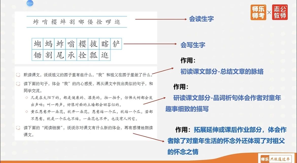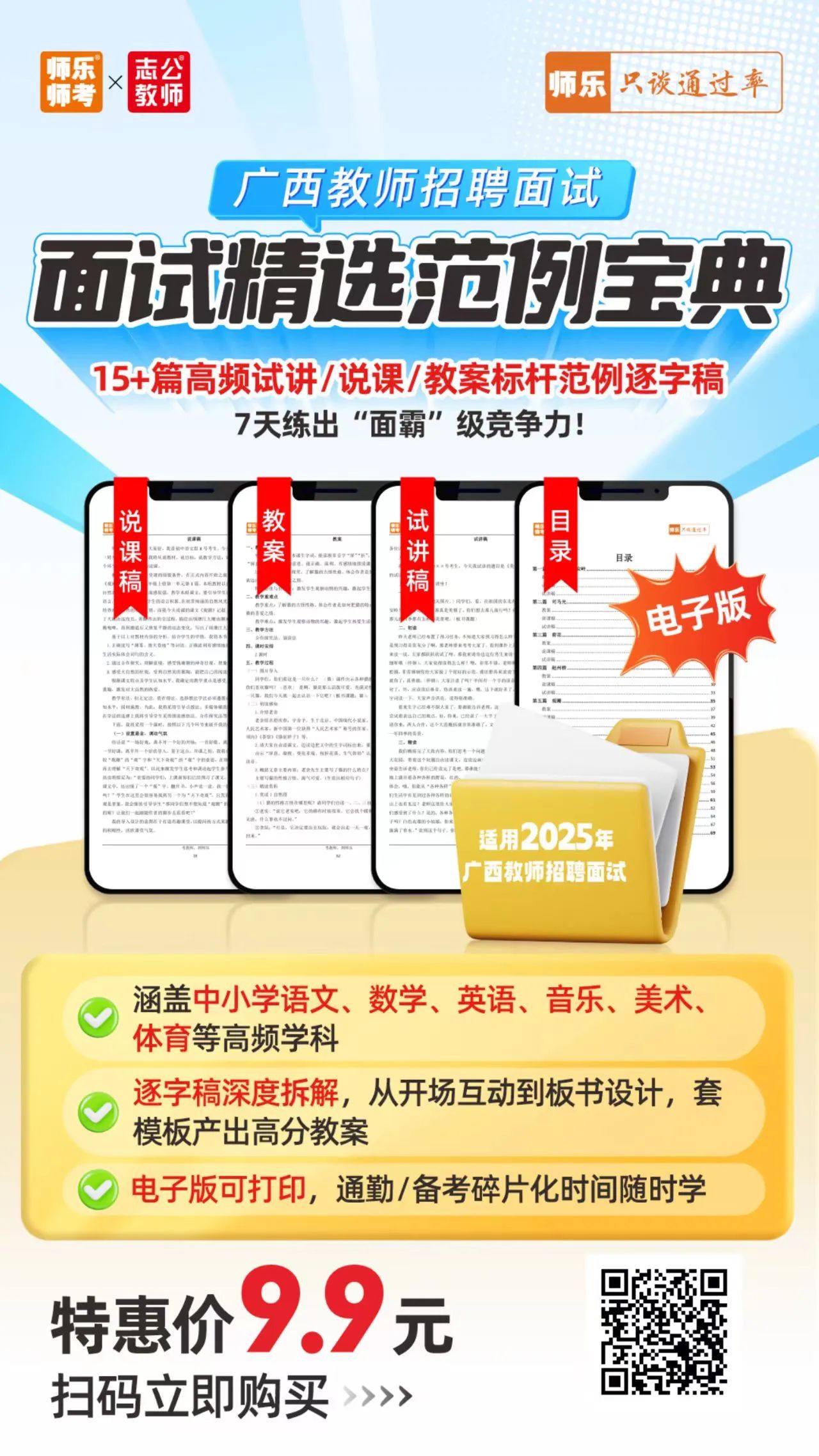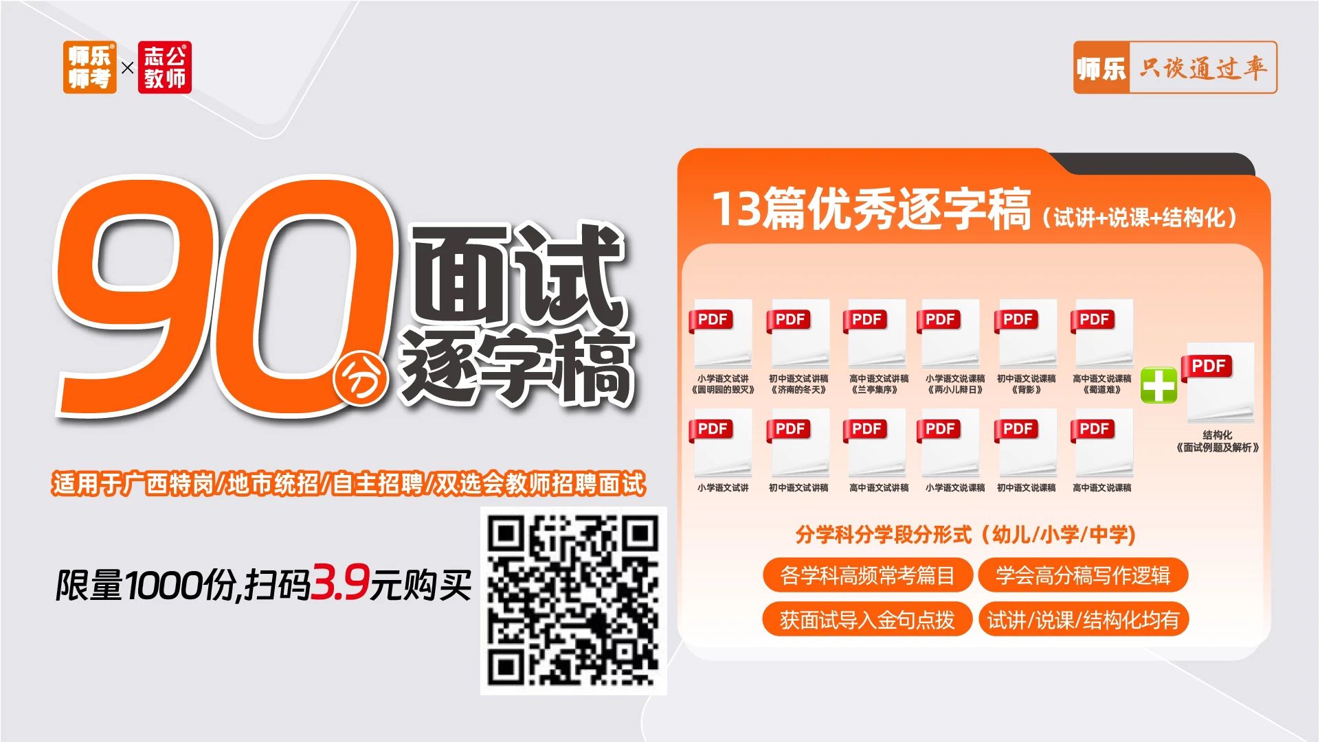 特惠價:199元 ?結合歷年考情,分模塊系統(tǒng)梳理考試篇目 ?分篇目分步驟詳解教學設計,提升備課速度 毫無思路怎么辦? 缺乏知識儲備怎么辦? 網課將精選核心課型 深入進行教材梳理 網課內容示例 ↓↓ 搶先體驗價:3.9元 ??語/數(shù)/英/幼/音/體/美/文綜/理綜 ??各學科高頻常考篇目 ??寫作邏輯+面試導入金句點撥 ?含13+篇試講+說課+結構化 搶先體驗價:6.9元 ??14地市教招面試zhen題 了解試講/說課/結構化形式及內容 面試禮儀課 ??面試禮儀干貨介紹 正反面案例直觀對比 ??著裝、問候、儀態(tài)、言談禮儀等事項介紹 【師樂】廣西教招備考群 ??最新公告 備考資料 ??刷題打卡 考試交流