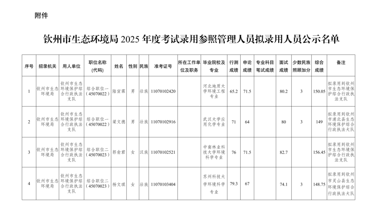 根據(jù)《廣西壯族自治區(qū)2025年度考試錄用公務(wù)員公告》等有關(guān)規(guī)定,我單位2025年計(jì)劃招錄4名參照管理人員,經(jīng)過公開報(bào)名、資格審查、筆試、面試、體檢、考察等程序,擬錄用陸宣霖等4名同志(附件)為參照管理人員,現(xiàn)予以公示。公示期5個工作日,如對擬錄用人員的錄用資格有異議,請?jiān)诠酒趦?nèi)向欽州市生態(tài)環(huán)境局辦公室實(shí)名反映。