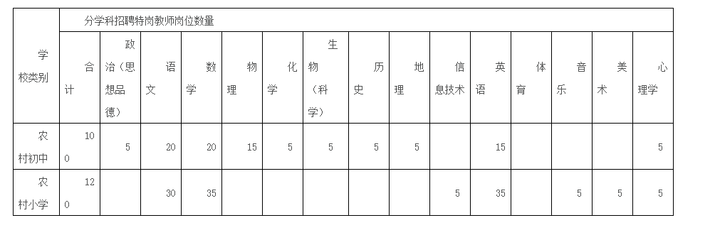 計劃招聘特崗教師220名,其中:小學120名,初中100名。具體崗位計劃如下表。