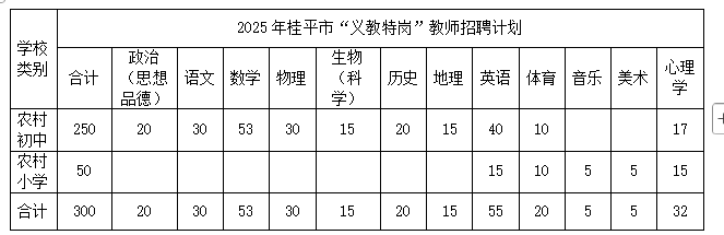 經(jīng)自治區(qū)教育廳、黨委編辦、財政廳、人社廳批準(zhǔn),2025年桂平市“義教特崗”教師招聘計劃共300名,其中初中250名、小學(xué)50名。詳情見下表: