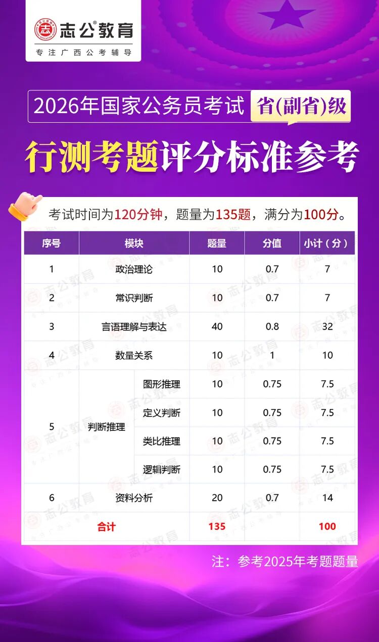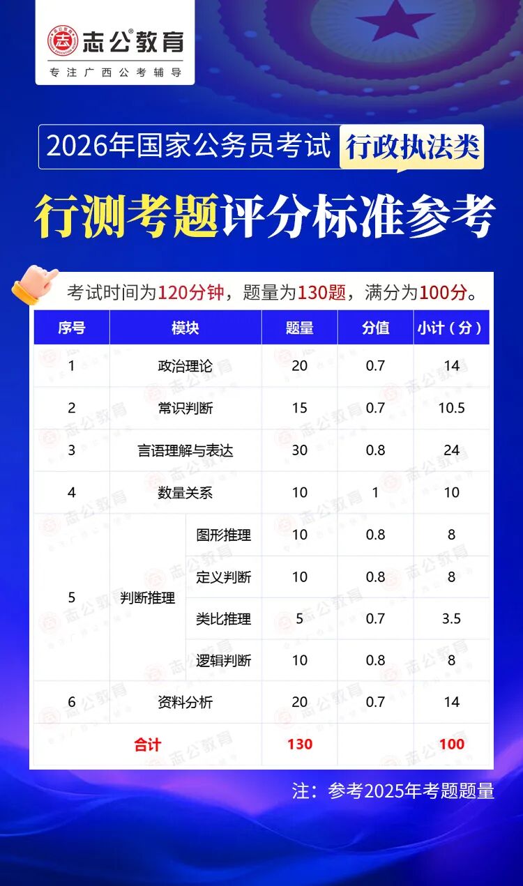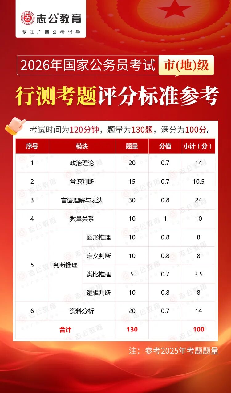 無(wú)論報(bào)名人數(shù)是否會(huì)增加,提升自身實(shí)力才是應(yīng)對(duì)2026年國(guó)考的關(guān)鍵。行測(cè)作為國(guó)考公共科目筆試的核心模塊,不僅分值占比高(通常為 100 分),更是考生之間拉開分差的關(guān)鍵戰(zhàn)場(chǎng)。它并非單純考查知識(shí)儲(chǔ)備,而是通過(guò)言語(yǔ)理解、判斷推理、數(shù)量關(guān)系、資料分析、常識(shí)判斷、政治理論六大板塊,綜合評(píng)估考生的信息處理速度、邏輯思維能力、應(yīng)急決策水平等綜合素質(zhì)。