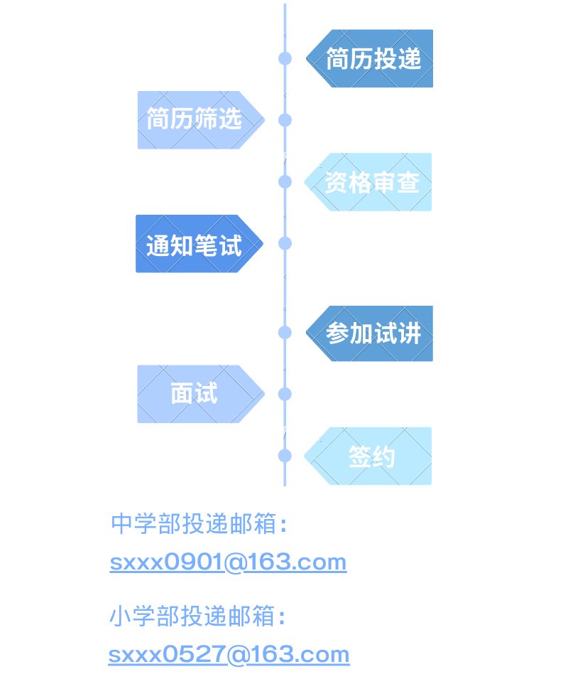 請(qǐng)將個(gè)人簡歷(Word或PDF版本)、一張個(gè)人生活照以電子郵件附件形式發(fā)送至報(bào)名崗位對(duì)應(yīng)的郵箱(如有作品,請(qǐng)將作品集一起發(fā)送到報(bào)名郵箱),郵件主題和附件文件名請(qǐng)備注:應(yīng)聘學(xué)科+姓名+畢業(yè)學(xué)校。