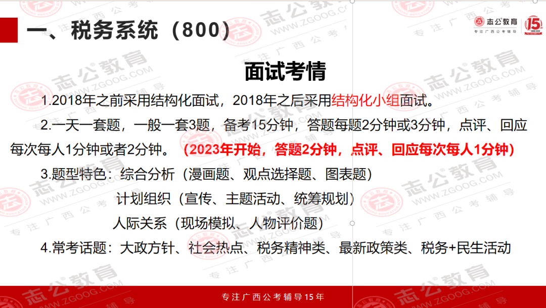 自2018年開始,稅務(wù)系統(tǒng)率先在結(jié)構(gòu)化面試的基礎(chǔ)上,采用了一種新的面試形式——結(jié)構(gòu)化小組面試。在這種模式下,題目的類型和結(jié)構(gòu)化面試基本沒有區(qū)別,但是作答模式發(fā)生了改變。