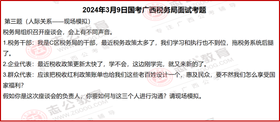 2??實務(wù)場景的解決能力座談會模擬題中,干部、企業(yè)、群眾的訴求各有不同:干部需要 “學(xué)習(xí)減負的方法”,企業(yè)需要 “政策傳遞的高效渠道”,群眾需要 “紅利賬單的普及”,考生的回應(yīng)不能只說 “我會解決”,而要給出稅務(wù)工作中實際可用的辦法(比如給干部開 “政策精簡小課堂”,給企業(yè)推 “政策精準推送系統(tǒng)”)。