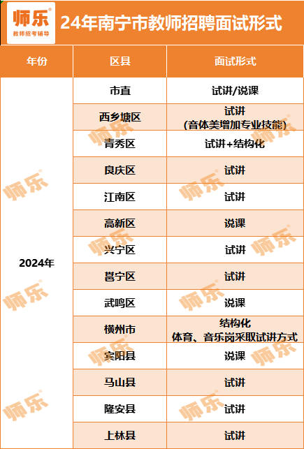 南寧市各區(qū)縣教招面試方式為:試講、說課或試講+結(jié)構(gòu)化。